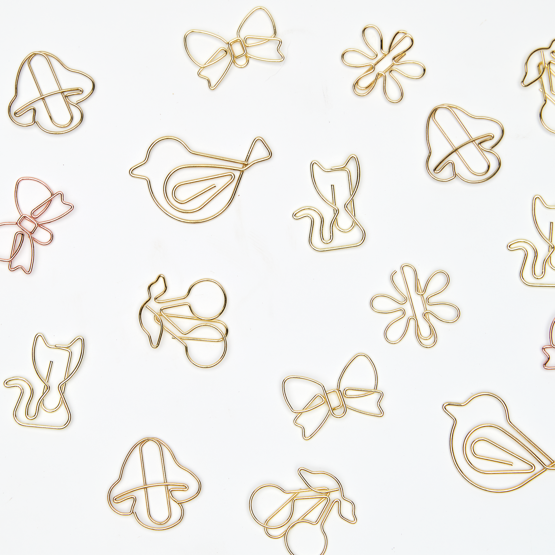 Fun gold paper clips in the shape of bows, cherries, cats, flowers, and more. Whether you’re gifting, journaling, or just want a sprinkle of golden joy in your office, these paper clips are a clever way to add some whimsy to your desk.