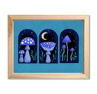 An original hand-drawn landscape illustration of three mushroom scenes in arches with leaves and dark sky with the moon against a turquoise background printed on textured 216 gsm archival paper.