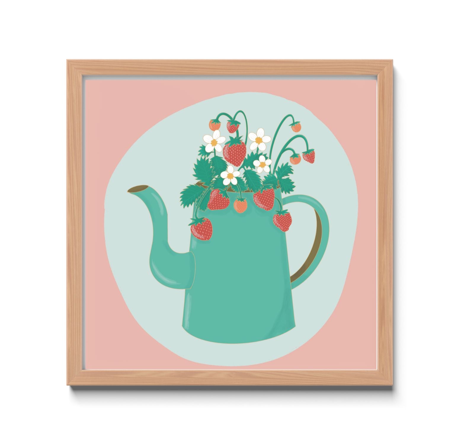 An original hand-drawn illustration of a turquoise teapot with wild strawberries and white flowers in it on a light blue and pink background printed on textured 216 gsm archival paper.