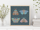 An original hand-drawn illustration of four matching moths in shades of blue on a navy background with a subtle floral pattern printed on textured 216 gsm archival paper.