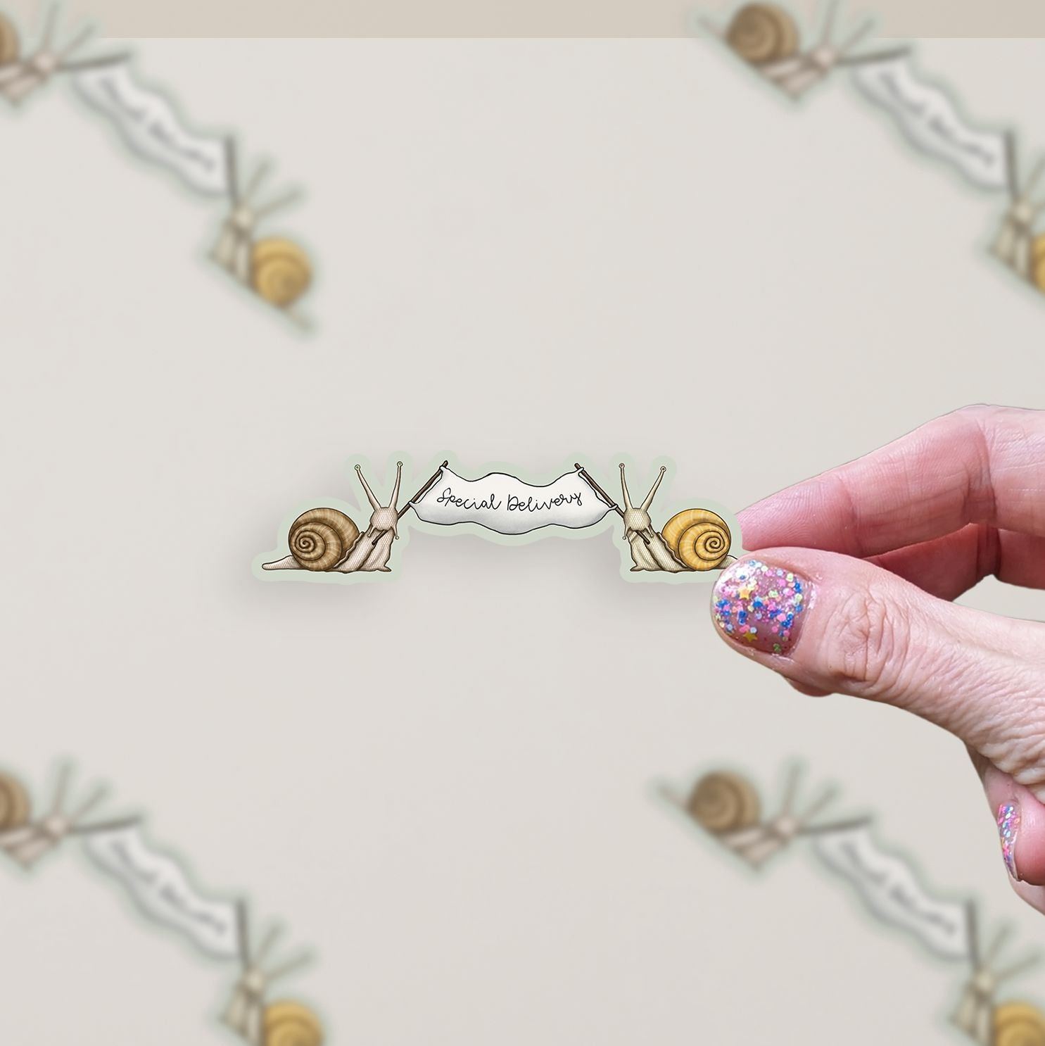 This adorable die-cut matte vinyl sticker features our hand-drawn illustration of two snails holding a banner that says, "Special Delivery" on a pale green  background. This snail mail sticker is a fun way to dress up your cell phone case, laptop, tumbler, or water bottle and are great for adding to postal mail, a journal, or a planner. Crafted from high-quality matte vinyl, this sticker is not just stylish but also durable and weather-resistant, ensuring it can withstand the elements and everyday wear and tear.
