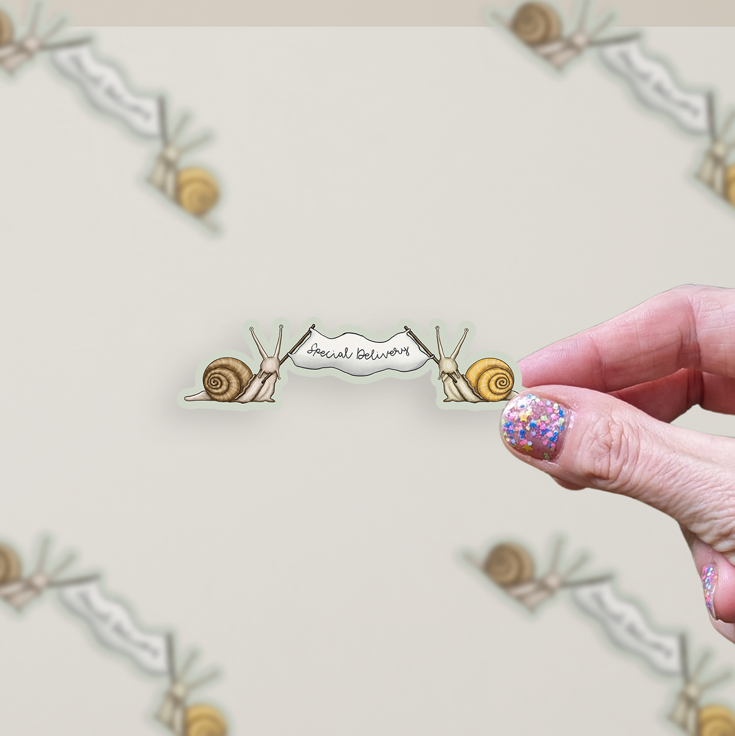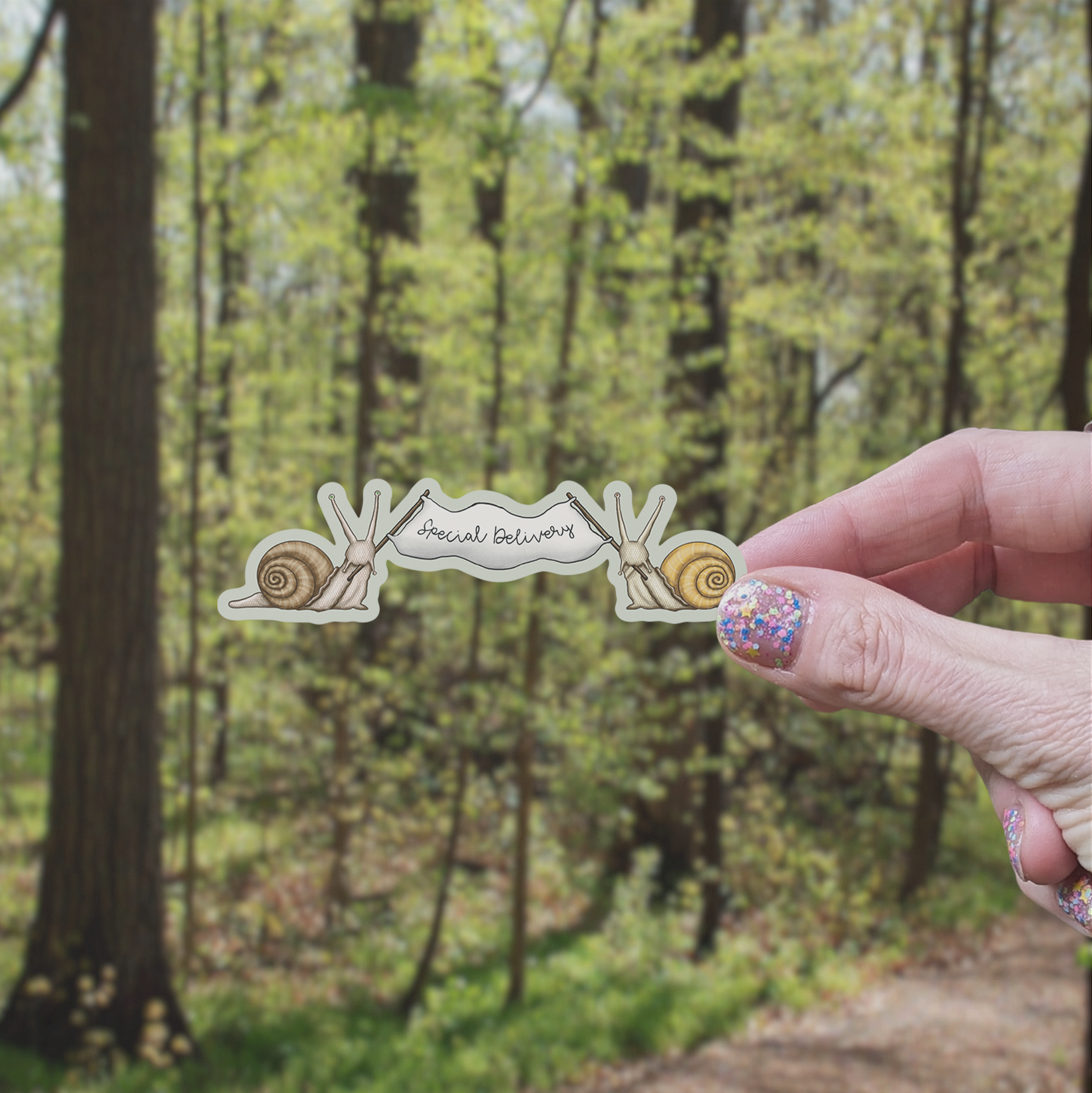 This adorable die-cut matte vinyl sticker features our hand-drawn illustration of two snails holding a banner that says, "Special Delivery" on a pale green  background. This snail mail sticker is a fun way to dress up your cell phone case, laptop, tumbler, or water bottle and are great for adding to postal mail, a journal, or a planner. Crafted from high-quality matte vinyl, this sticker is not just stylish but also durable and weather-resistant, ensuring it can withstand the elements and everyday wear and tear.