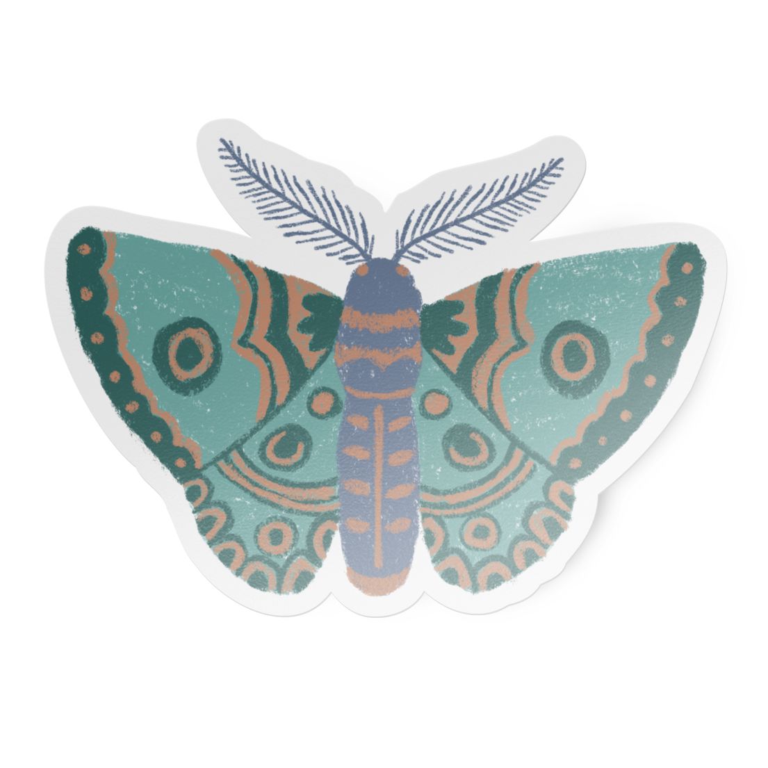 Solenne brings bold symmetry and vibrant colors to this richly patterned moth sticker. With its ornate wing design and hand-drawn charm, this matte vinyl sticker stands out on laptops, journals, planners, and water bottles. Weatherproof and printed using eco-solvent inks, it's built for creativity that sticks.